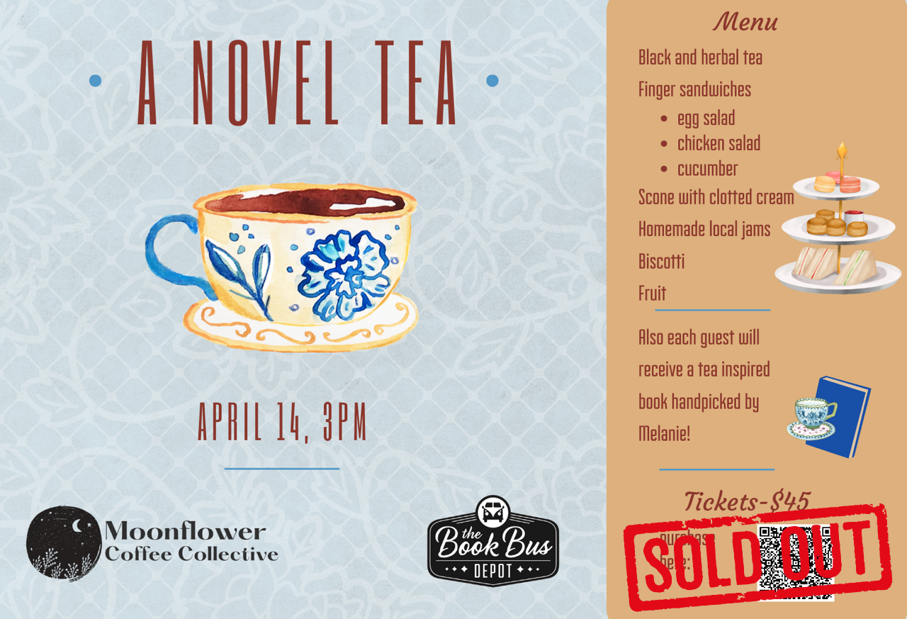 Books + Tea! Welcome to A Novel Tea! Calling all bookworms to join us for an afternoon of literary delights. Each ticket offers a delightful lite bite tea, featuring a book selected by Melanie herself (a Book Bus Exclusive!), and the chance to spend quality time with fellow book lovers. Indulge in a menu of black and herbal teas, accompanied by finger sandwiches (egg salad, chicken salad, cucumber), scones with clotted cream and homemade local jams, biscotti, and fresh fruit.