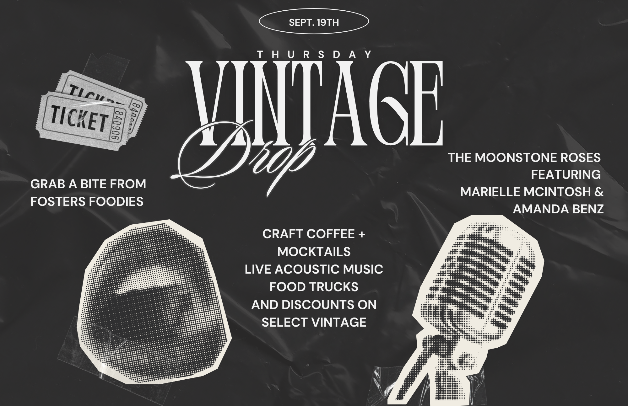 Join us for Vintage Drop Thursday on September 19th at Moonflower Coffee Collective! We're excited to stay open until 8 PM for an evening filled with vintage shopping, great food, and live music. Fosters Foodies will be serving up delicious grilled favorites like loaded fries, salmon burgers, street tacos, and hibachi-style dishes. While you browse, enjoy the acoustic harmonic duo The Moonstone Roses, featuring Marielle McIntosh and Amanda Benz, performing uplifting songs about herbalism and self-care.